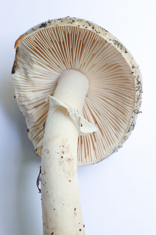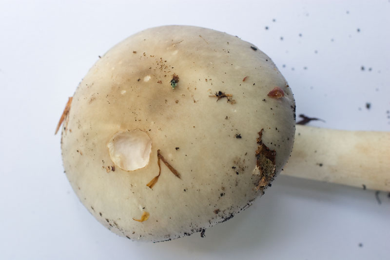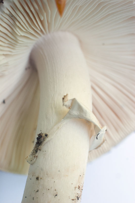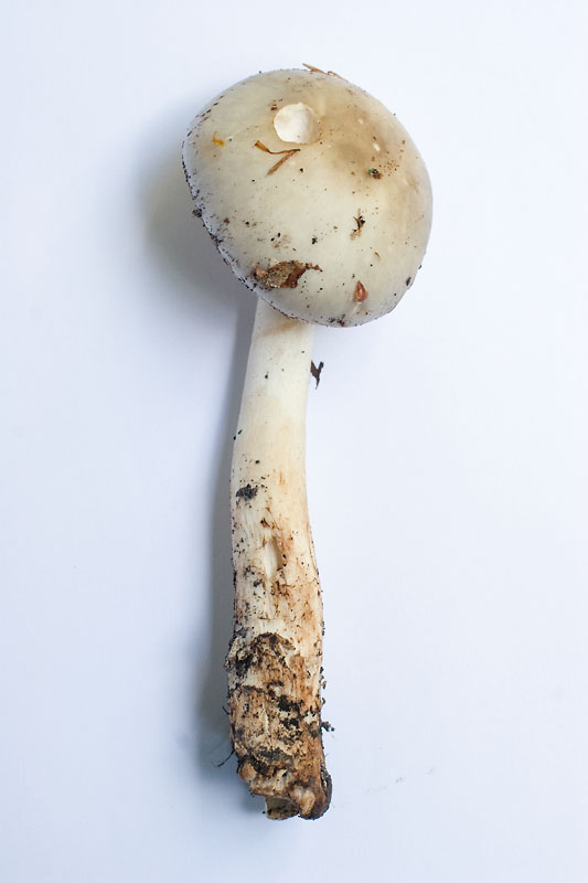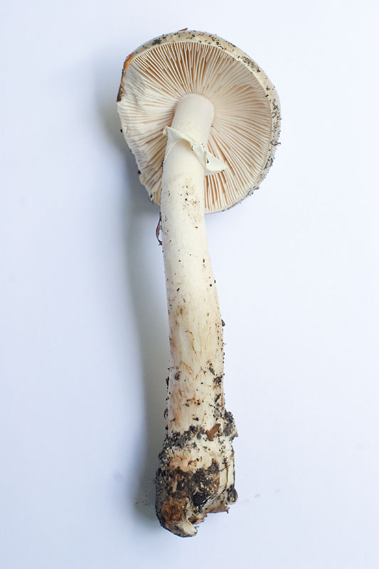 zu grübeln gibt mir eine amanita unter buche aus dem phalloides-formenkreis, die ich seit einigen jahren an einem anderen standort regelmässig im frühsommer finde und nicht so recht einzuordnen weiss. nun am südwesthang, sonst mit nordwestgefälle, jeweils im wärmebegünstigten buchenmischwald auf buntsandstein. auffällig lang gestielte fk mit reinweissem, zylindrischem, ungenatterten stiel (0,9-1,5x17 cm); hängender, fragiler manschette und einem hauch vergänglicher volva, die auch mit viel mühe nicht heil aus dem tiefen grund zu hebeln ist. hut 8cm, konvex, glatt ohne velumreste, am rand minimal befasert, grundfarbe weiss, zur mitte hin grau. lamellen mit ganz leichtem rosastich. in der leider taxonomisch etwas unklaren phalloides-verwandtschaft von phalloides, phalloides var. alba und verna sprechen v.a. farbe und erscheinungszeit für a. verna nach südeuropäischer artauffassung. nun soll diese aber durch kleine fk mit flachem hut gekennzeichnet sein, das kommt gar nicht hin, auch nicht bei meinen früheren funden. also doch var. alba? leider konnte ich die pilze erst nach zwei tagen im kühlschrank ablichten. inzwischen hat sich, besonders an der unteren stielhälfte, eine deutliche, fast perlpilzartige, rostrote verfärbung eingestellt. die hutoberfläche ist insgesamt nachgedunkelt und hat sich von stumf-matt zu phalloides-glänzend entwickelt.