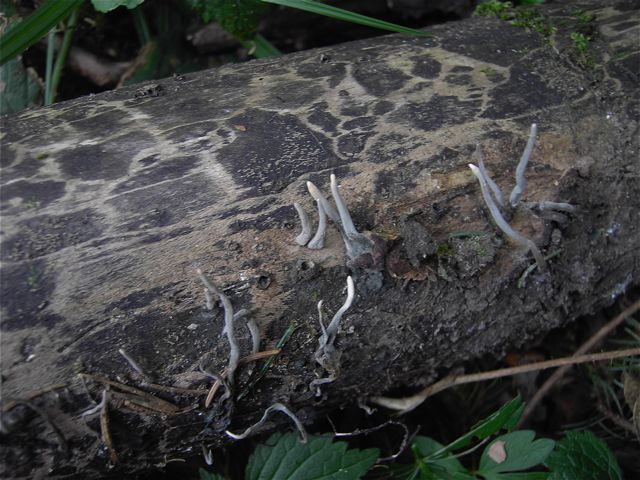 Ich habe noch eine Altlast: Immer wieder lassen sich so hübsche Äste im Wald finden. Ich meine, dass es sowohl Laub- als auch Nadelholz sein kann. An ihnen sind oft, wenn sie auf dem Boden aufliegen, solche Holzkeulen (?) zu sehen. Meine Fragen: Gibt es einen Zusammenhang zwischen der Zeichnung auf dem Holz und dem Pilz?