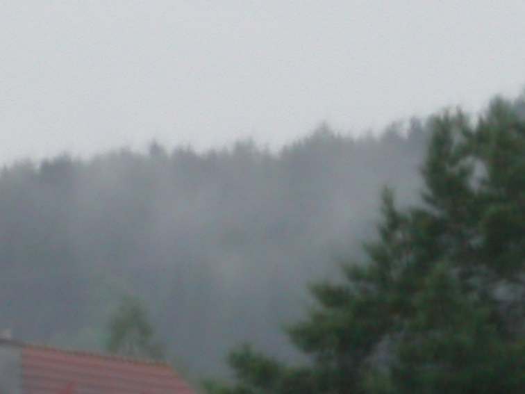 Durch den Regenschleier schaute ich auf den Wald über unserem Ort.
