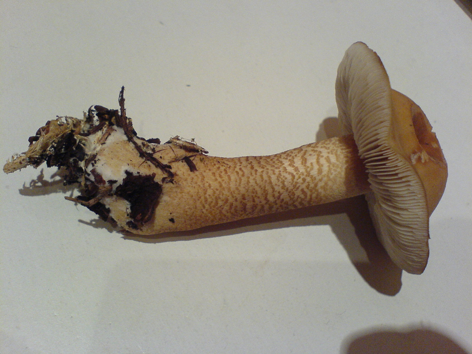 Hut 5cm, gebuckelt, hellbraun-ockerlich, Fleisch etwas heller, Stiel 6cm lang, 1cm durchmesser, hellbraun, dunkler genattert, weiße dicke Myzelstränge.