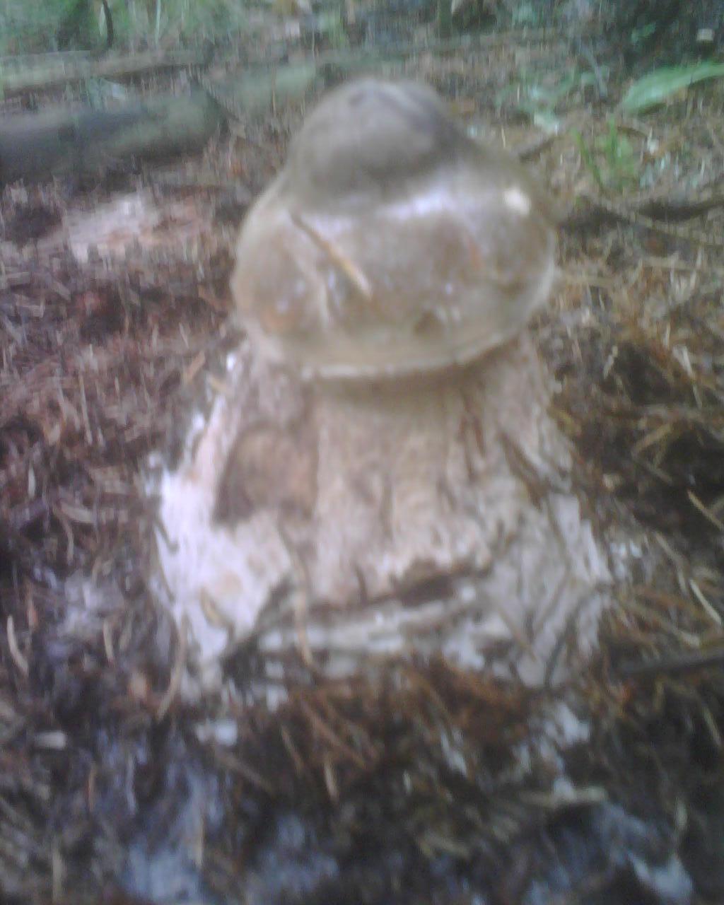 Ich habe heute nahe eines Wegrands auf saurem Boden in einem Fichten-Buchen-Mischwald im nördlichen Niederösterreich diesen mir sehr seltsam erscheinenden Pilz gesehen. Der Stiel ist 15 cm hoch und gut 10 cm dick, hartfleischig und dort, wo er die zahlreichen Einschlüsse von Nadeln und Steinen enthält, leicht rosa.