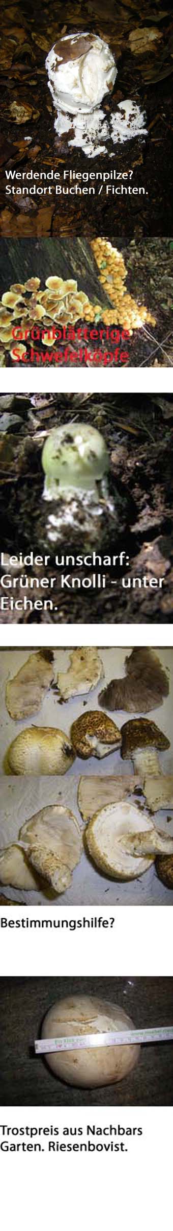 Mehr Pilze habe ich in Dormagen gefunden, Perlpilze im Wald, Riesenbovist und Champignons im Nachbargarten. Da kann man nur neidisch auf das Weserbergland, Bayern oder Schwarzwald schielen. Ich kann die Champignons nicht bestimmen. Vermute Rebhuhn Champignon.