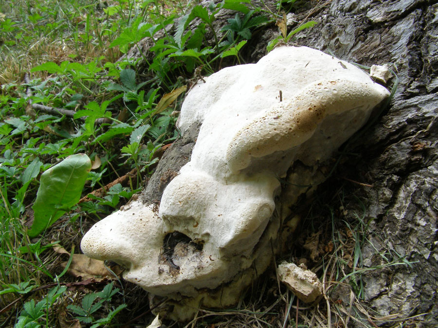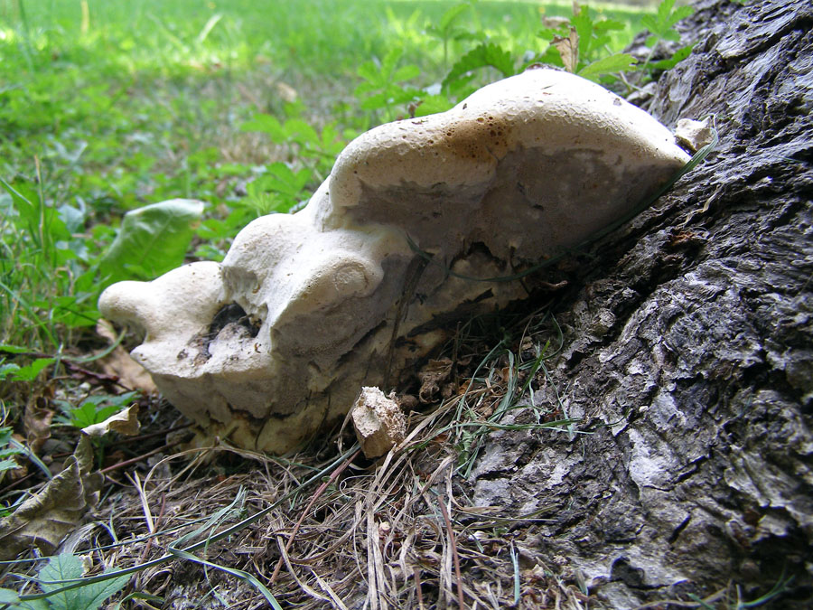 ist dieser Porling etwas Besonderes oder werde ich genarrt? Er wuchs am Fuß einer schwer geschädigten Eiche. Zudem hatte er offenbar Guttationströpfchen (siehe Rand). Da ist man relativ schnell beim Tropfenden Schillerporling, zumal es ja auch mit über 20 cm Durchmesser kein kleiner Pilz ist. Für mich gibt es einige ABERs: Tröpfchen in der Regel nicht braun eingetrocknet / Fruchtkörper ist frisch, aber sehr fest und korkig (konnte nur gewaltsam ein Stückchen abschneiden)/ Darf der Hut so hell sein? / Bild 2 zeigt randlich ein dunkles Zentrum, was auf ein mehrjähriges Wachstum deuten könnte.