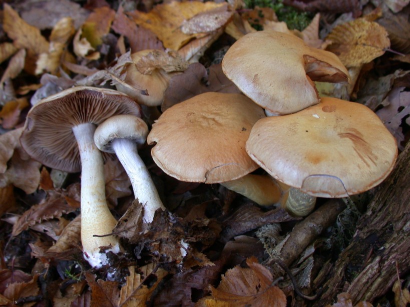 hallo zusammen, leider konnte dieser cortinarius nicht mikroskopiert werden. möglicherweise lässt sich die angelegenheit angesichts der rostbraunen stielnatterung makroskopisch trotzdem etwas eingrenzen? c. armillatus (geschmückter gürtelfuß) scheidet wegen der violetten lamellen wohl aus, für c. bulliardi sind die stielfarben wohl zu blass. hat jemand eine (andere) idee? am standort dominierten hainbuchen.