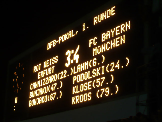Guten Morgen Gemeinde, ich muss hier mal kurz meine Euphorie los werden, einige werden es ja vielleicht gesehen haben wie Erfurt gestern gegen die Bayern gespielt hat. Als Erfurt-Fan war ich selbst im Stadion -es war wirklich ein Highlight, tolle Stimmung viele Tore. Wer dreimal einen Rückstand aufholt und sich so beachtlich verkauft - Respekt. Am Ende siegte die Cleverness und der Bayern-Dusel.