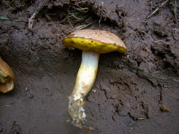 Der goldporige Röhrling, Pulveroboletus cramesinus. Die Huthaut schmeckt salzig, wenn man dran leckt.