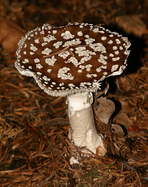 Hallo Pilzler, jetzt habe ich mich doch angemeldet. Erst mal vielen Dank für all die interessanten Beiträge, die ich hier bisher gelesen habe. Ich bin bestimmt kein Pilzspezialist, interessiere mich aber in letzter Zeit immer mehr dafür - und nicht nur für die essbaren. Heute, auf dem Rückweg aus dem Wald, habe ich noch diesen Pilz fotografiert, ich war der Meinung, es sei ein Pantherpilz. Jetzt, beim Anschauen der Bilder, sehe ich, dass der Pilz eine deutlich geriefte Manschette hat. Meine Bücher helfen mir nicht weiter. Ich habe solche Pilze schon öfter in verschiedenen Entwicklungsstadien gesehen und immer für Pantherpilze gehalten. Immer diese schokobraune Farbe und hellweiße Flocken. Für Euch wahrscheinlich ganz einfach, wer ist das? Schönen Gruß,