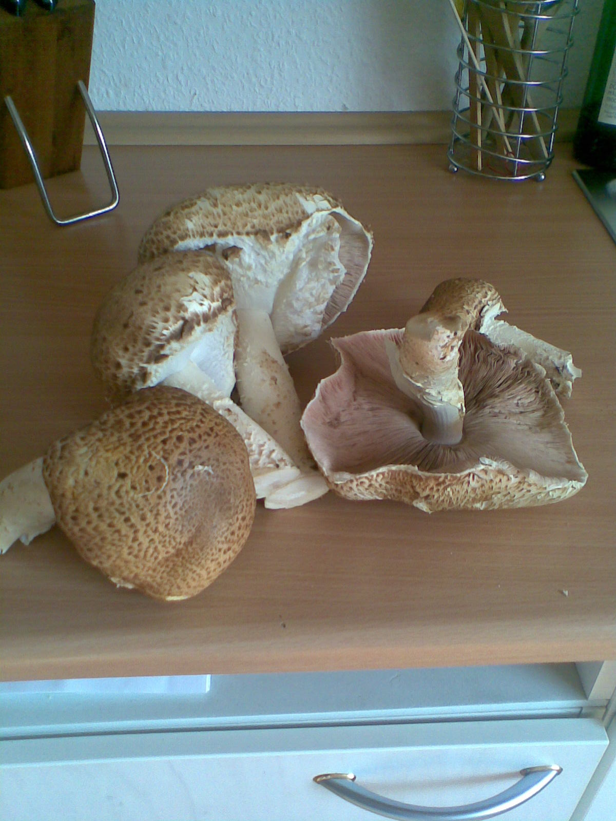 habe heute vor meiner Haustür diese Pilze gefunden. Eigentlich bin ich mir recht sicher, daß es sich dabei um den Riesenchampignon handelt.