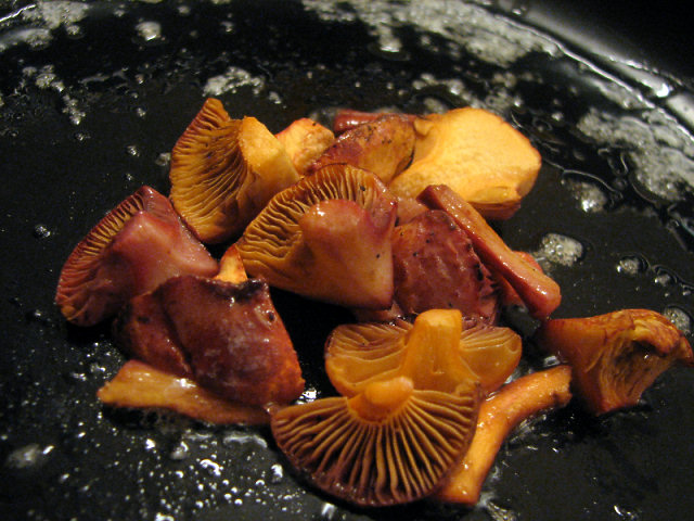 die Pfanne lechzend anstarrende Grüße und Fichtenreizkerschnipsel nachfüllend