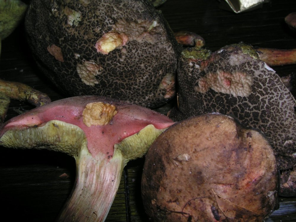 Bei dem linken unteren Pilz müsste es sich wohl nach weiterer Recherche um den blutroten Filzröhrling handeln?! Laut Buch tippten wir zunächst auf den aprikosefarbenen Filzröhrling.