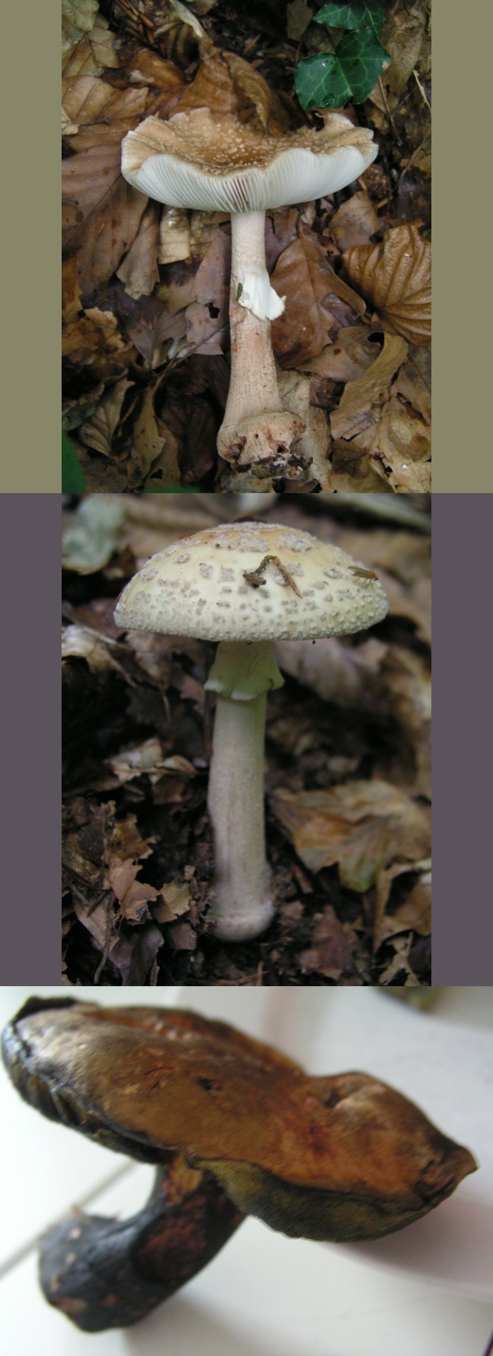 Nachdem ich jetzt vorhabe, mich auch an Blätterpilzen zumindest einmal zu versuchen, würde ich gerne giftige Arten erstmal möglichst gut identifizieren können. Deshalb meine Frage: Handelt es sich bei den beiden obere Pilzen um alte Fliegen- / Pantherpilze oder um andere Knollis? Mich stört die braune Farbe, die auch nur in der Mitte noch vorhanden ist...