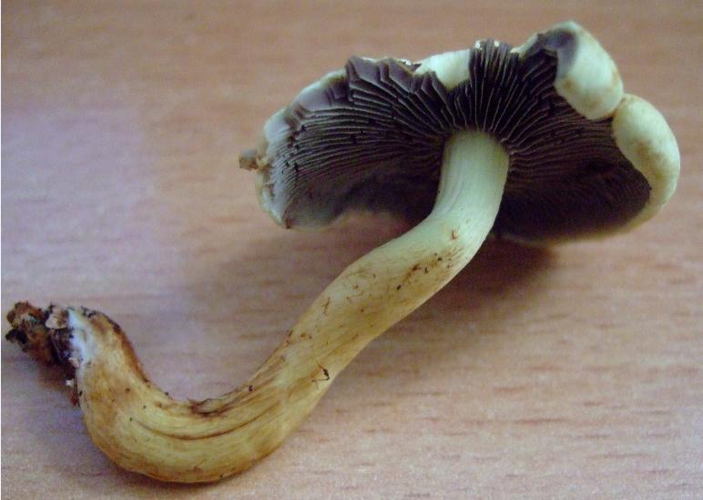 Der Pilz ist oben gelblich, auf der Unterseite des Hutes jedoch dunkelbraun.