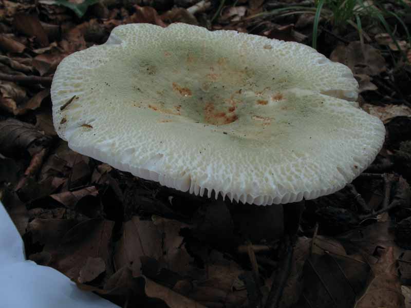 Ist die Felderung noch grob genug für R. virescens. Leider sind keine weiteren Untersuchungen mehr möglich, schon bei dem Versuch Sporenpulver zu bekommen zerfiel der Pilz von Maden zerfressen :-(. Die Lamellen splitterten und der Geschmack war sehr mild, nussartig.