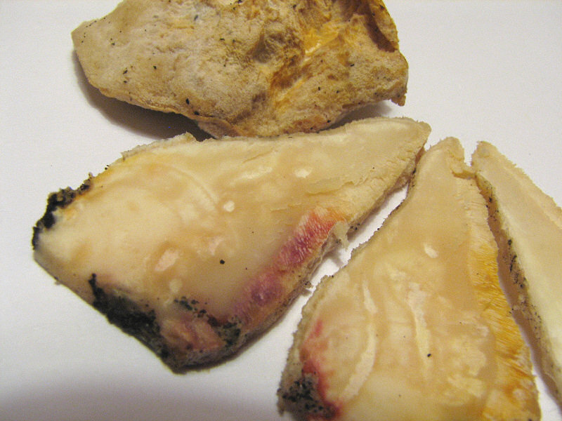Was für T.kmetii spricht ist das Substrat und die Ähnlichkeit beim groben Bildvergleich im Netz. Auch farblich. Mag jemand mikroskopieren? Unten angehängt nochmal ein Schnittbild und die Verfärbung mit (in Ermangelung von KOH) Ammoniak. Nur Röhrenschicht und die oberste Huthaut verfärben sich, die Trama nicht. Was nun? rätselnde Grüße
