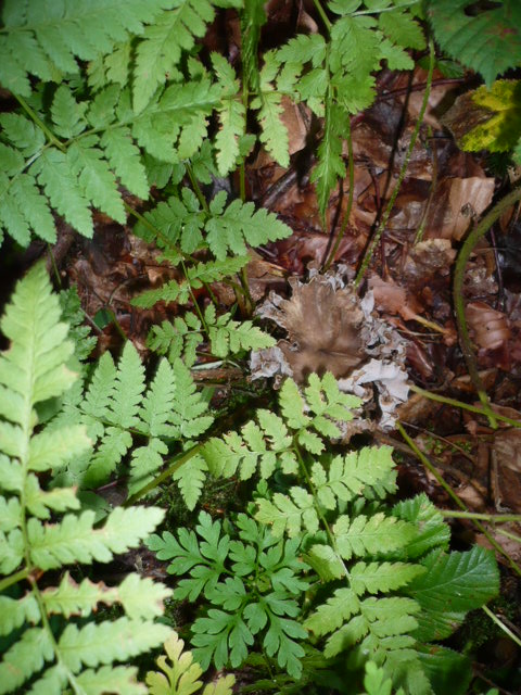 nahe bei Herbsttrompeten gibt es bueschelweise auf alten Buchenstruenken oder einzeln an jungen Buchenstaemmchen die duennstieligen "Friseegekrausten" in der Hutmitte ist ein kleines Kraterloechlein. (Kraterelle?) Hutbreite 2-10 cm