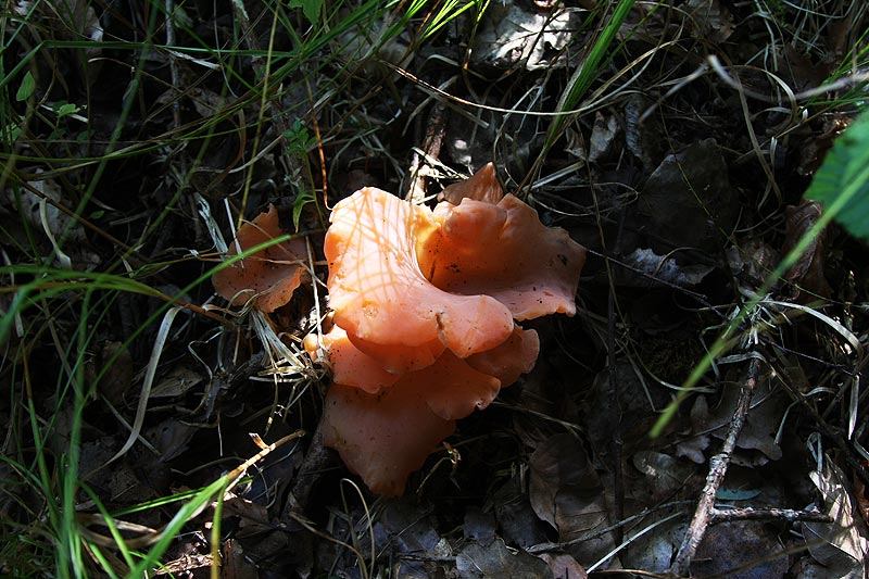 gefolgt von einem roten Gallerttrichter(Tremellus helvelloides) mit