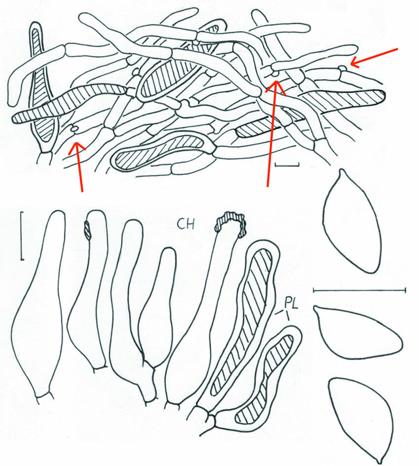 Hallo Inge, das ist ein nur im Mikroskop zu sehendes Merkmal. Es betrifft die Hyphen, also die Zellfäden aus denen das Fleisch des Pilzes aufgebaut ist. Diese Zellstränge bestehen aus länglichen Einzelzellen, und die Trennwand zwischen einer Zelle und der nächsten nennt man Septe. Nun gibt es Pilzarten, bei denen an der Septe ein Bogen außen herum geht, die sogenannte Schnalle. Hier angehängt ein Beispiel von der Huthaut einer Lactocollybia, wo ich ein paar dieser Schnallen eingezeichnet habe. Fotos habe ich grad keine greifbar, aber die Zeichnung tut's bestimmt auch. beste Grüße,