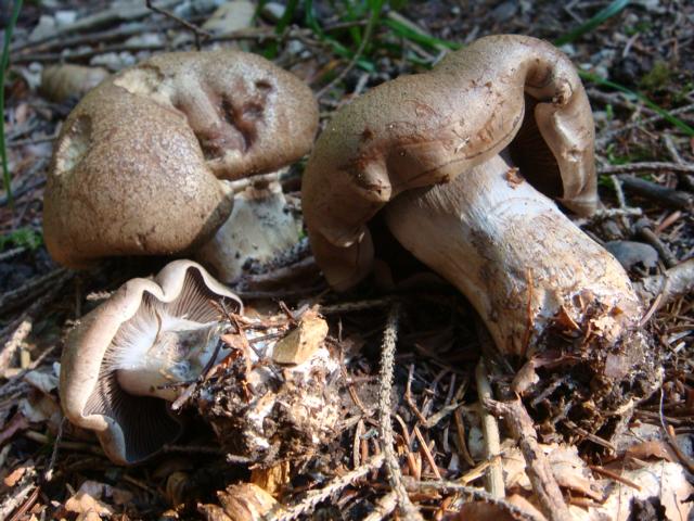 Liebe Pilzgemeinde Ich habe unter Fichte einen massiven, braunen Schleierling gefunden. Der Fruchtkörper rechts hat einen Stiel von 7x3cm. Auffallend ist der Hutrand mit beige abgesetzter Zone, der auch alt eingerollt ist. Die Stielspitze ist blass violettlich, weiter unten weisslich, braun überfasert. Die Stielbasis ist nicht knollig und höchstens ganz leicht keulig. Die Sporen sind zitronenförmig (5x8). Hat jemand eine Idee? Gruss