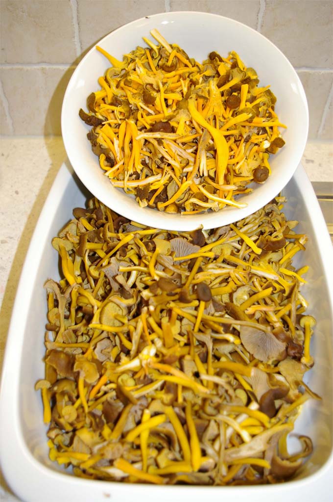 hier im neuen Wohngebiet (Zugspitze) habe ich das erste Mal auch eine Menge Trompetenpfifferlinge und Kraterellen gefunden. Leider keine Totentrompeten dabei. Man muss schon beim Sammeln aufpassen, was alles dazwischen wachsen kann. In den hohlen Stielen verstecken sich gern ganze weiße Würme - also besser aufschlitzen. Kochen sehr viel runter. Trotzdem eine leckere Sache.