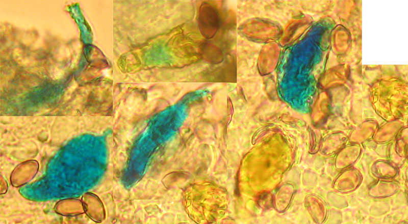 Ich habe die Lamellenflächen nach Zystiden abgesucht, leider nicht viel gefunden, hier ein Versuch im Patent Blau, sind diese Gebilde überhaupt Chrysozystiden?: