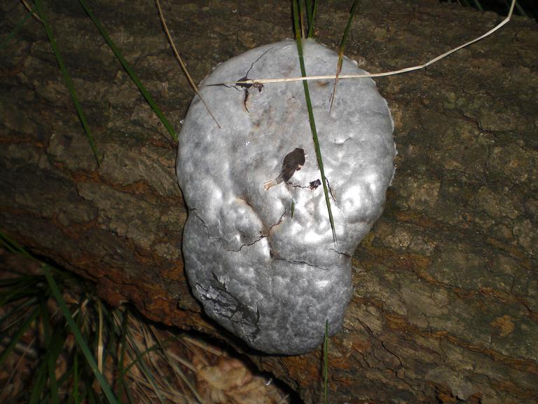 Dieser Pilz hat aussen eine Art silbrige Haut , sehr dünn , und ein schwarzes , weiches Inneres .Er hatte sich an einer gefällten Eiche gebildet . Kennt ihn jemand ?