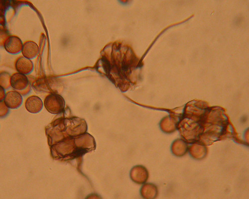Die Sporen sind rund, fein stachelig und messen um die 11ym. Dazu kommen die beideitig beschnürten Martins-Laternen (übrigens alkoholfrei)!