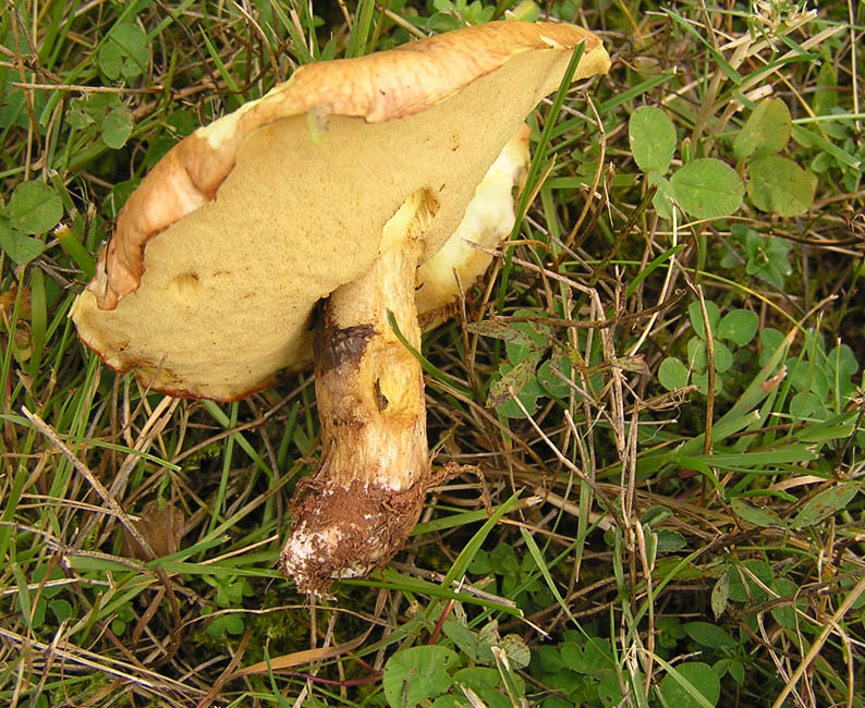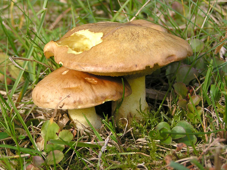 Die Ringlosen Butterpilze / Suillus collinitus haben ihren Standort etwas weiter von der Kiefer weg in den Rasen verlagert.