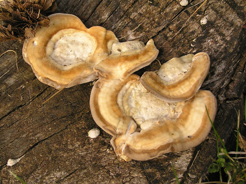 Auf den Stumpf- bzw. Wurzelresten eines abgesägen Kirschbaums wachsen schon seit letztem Jahr schöne Striegelige Trameten / Tametes hirsuta.