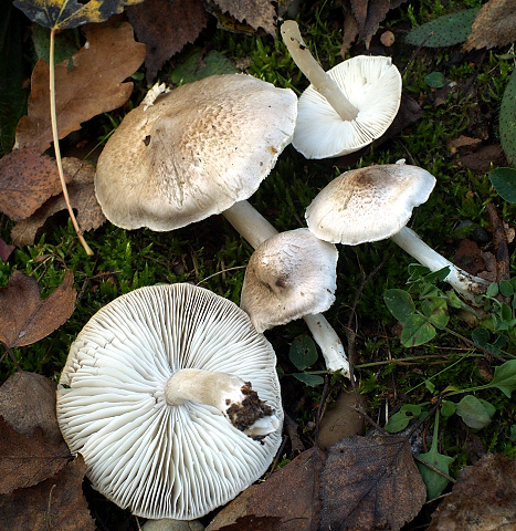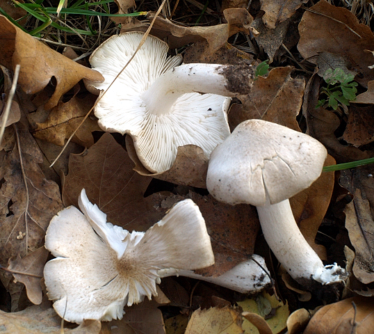 2.+ 3. Gestern unter Birken sehr blasse, teilweise spitzgebuckelte Erdritterlinge mit deutlichem Mehlgeruch, die auch heute partout nicht gilben wollen: