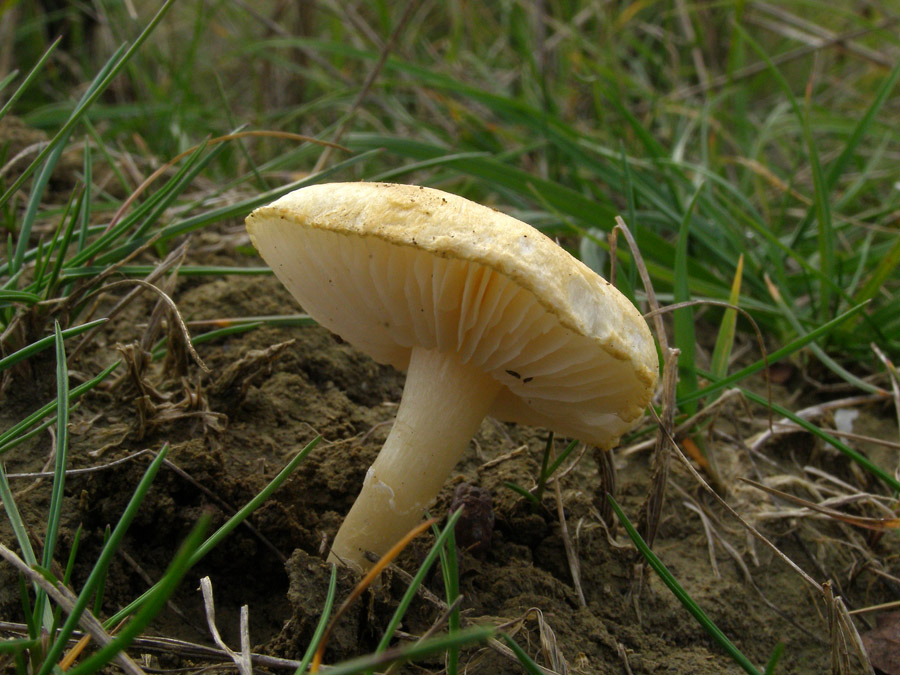 1. Fund aus einem halbtrockenen Magerrasen auf Kalk. Leider sport der Pilz bislang nicht aus; auch im Quetschpräparat fand ich keine Sporen. Ich kann also nicht ganz ausschließen, dass die Lamellen eigentlich von Sporen gefärbt sein müssten. Falls der Pilz typisch aussieht und falls ihn schon mal jemand durchbestimmt hat, würde ich mich über die Art oder doch wenigstens einen Tipp freuen. Der Hut ist filzig und neigt zum Gilben. Geruch nichtig; Geschmack wie Papier. Was gab es noch zu beobachten? Schnallen an den Hyphen sind eigentlich nicht die Sensation.