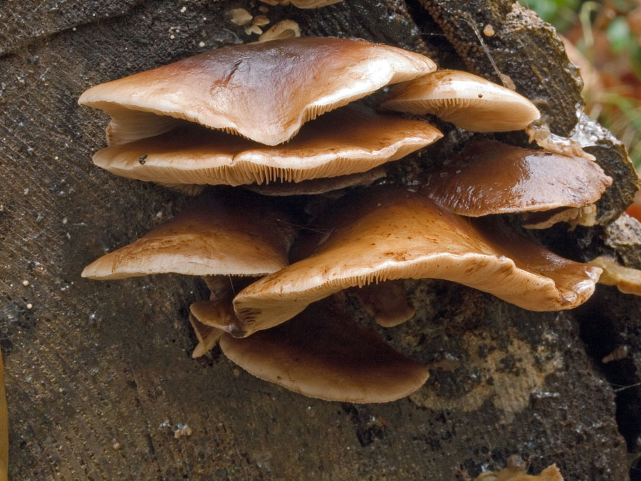 Hallo zusammen, den folgenden Pilz fand ich heute, villeicht hat jemand eine Idee, das wäre ganz schön: Fundort: 28.10.2008 am Rand eines Auwaldes, Wegrand, aufgewachsen auf Totholz (Laubholz) Sporenfarbe: dunkelbraun, umbrabraun Sporen: ca. 7,4-9,8 x 5,0-5,3 Hut: bis 7 cm, seitlich stiellos am Holz festgewachsen, gelatinös, leicht klebrig, bräunlich mit weißen/braunen Flecken, nach außen ziemlich dünnlappig an der Stamm-Anwachsstelle dicker Lamellen: zuerst grau-schmutzigweißlich, später braun Geruch: sehr schwach, leicht pilzig Fleisch: weißlich oberhalb der Lamellenschicht Viele Grüße Wolfgang