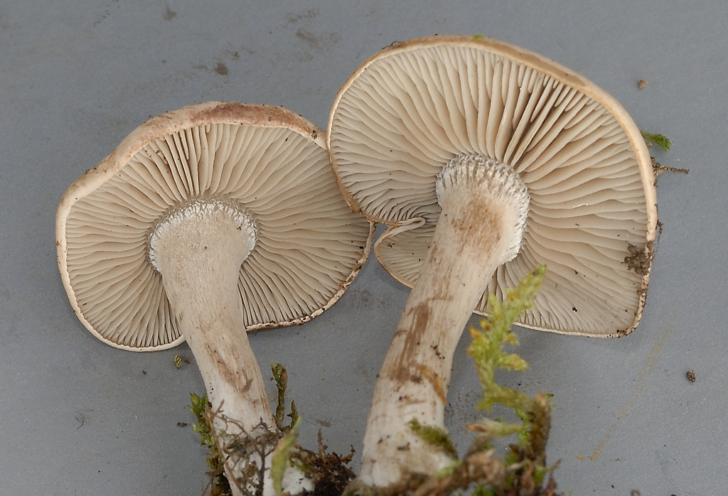 Ich eiere noch durch die Gattungen, von Arten gar nicht zu reden. Hutdurchmesser des größten Pilzes ca. 42 x 48 mm. Oberfläche glatt. Alle Hüte einseitig vom Rand her eingezogen (auf dem Foto oben am besten am rechten Exemplar zu erkennen, siehe auch Foto unten rechts), teilweise mittig etwas eingesenkt. Gesamthöhe ca. 50 mm. Stiel auf beigefarbenem Grund von unten an bis oben aus fein weiß bereift. Am oberen Ende auffallend verdickt und abgesetzt (beinahe wie beim Zwergknäueling - dem ähneln sie formal grob auch von oben).