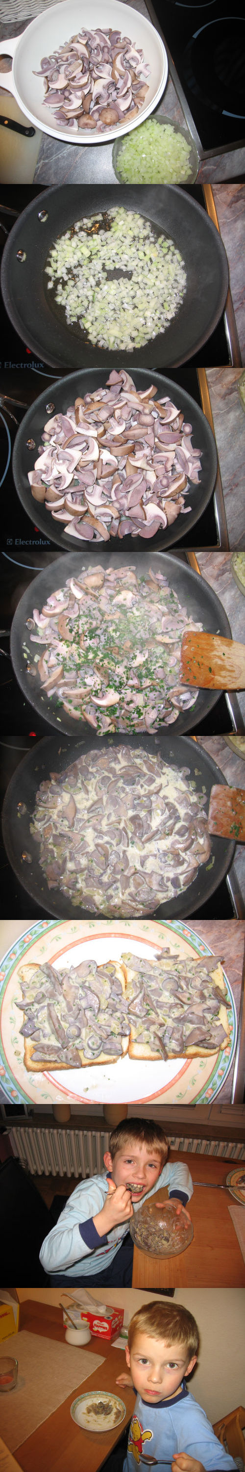 Hi, erst die "Rohware", dann die Zwiebeln in die Pfanne, die Pilze dazu (mit Salz und Pfeffer), Petersilie und anschließend ein Schuss Sahne. Ich mag´s gern auf Toast, meine beiden Jungs lieber "pur" :-)) Lecker! Grüße Boris