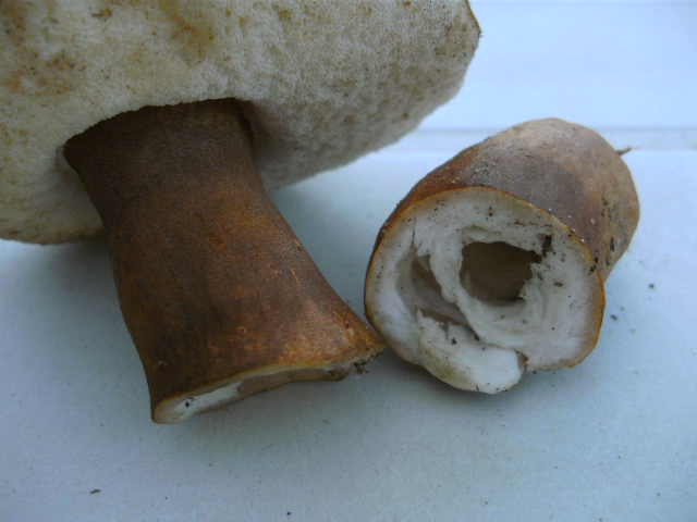 Junge Korkeichenpflanzung, Stiel hohl wattig, gleichmäßig dunkelbraun gefärbter Stiel bis ganz oben zu den freien Röhren. Hut fast orangefarben (wie Milchbrätling).
