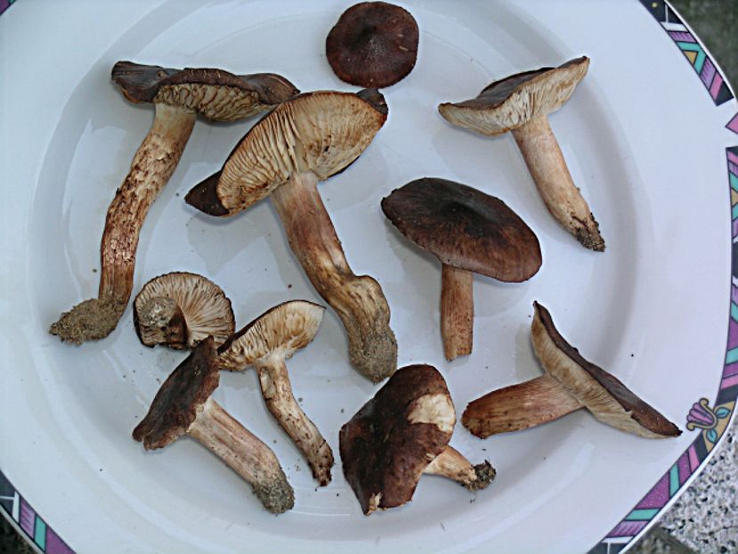 Und das hier sind auf keinen Fall Tricholoma pessundatum, so wie ich sie mir vorstelle - obschon mit den anderen fröhlich durcheinander gewachsen. Das müssten typische Tricholoma stans sein (oder ich müsste mein Konzept von denen wieder mal umschmeißen): ziemlich schmächtig (zumindest ausgewachsen auffallend kleiner als striatum - albobrunneum - pessundatum); Hutrand nur sehr jung eingerollt, relativ bald aber hochgeschlagen wie ein Regenschirm, der bei Sturmwetter "umschlägt"; ausgesprochen weichfleischig und im Gegensatz zu den anderen das Regenwasser geradezu aufsaugend, was bei einem Längsschnitt besonders in der oberen Stielhäfte feststellbar ist; nach einiger Lagerzeit ausgesprochen braunfleckend; Hutfarbe ein etwas "kälteres" Braun als das warme Rotbraun bei striatum - albobrunneum - fracticum; Huthaut schwarz radialfaserig.