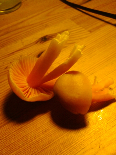 Lieber Ingo, der ist nicht feucht oder schmierig oben, keiner von den vielen, die da waren. Eher seidig heller gelb oben, so etwa 0,5 cm am Rand dann dunkler. Lamellen richtig tieforange, desgleichen oben am Stiel. Stiel sehr breit und hohl. Hutbreite offen ca. bis 4-5 cm die meisten; ein bißchen breiter die ganz alten.