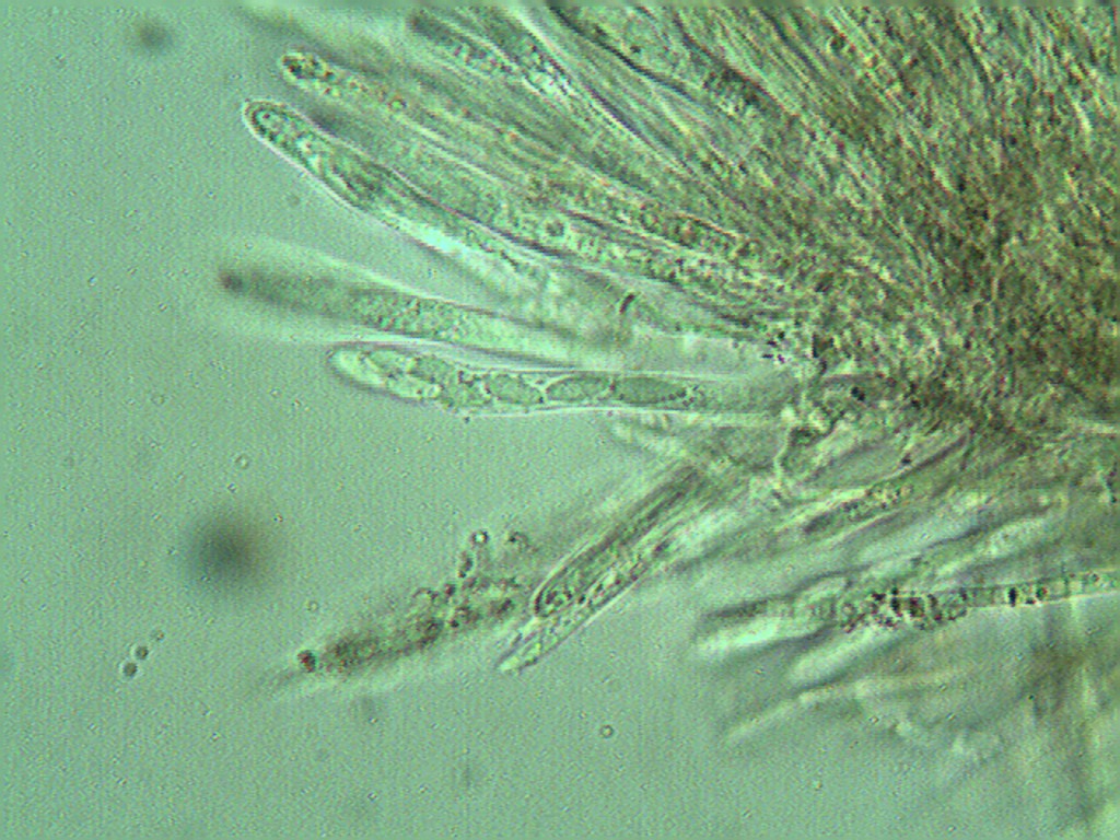 Zu N.cerinus passt fast alles, die Paraphysen, die septierten und inkrustierten Haare, die Sporengröße. Es passt nicht die Farbe, die ein dunkles Oliv ist und es passt nicht das Wachstum auf entrindetem Holz, das Holzstück hat noch seine Rinde.
