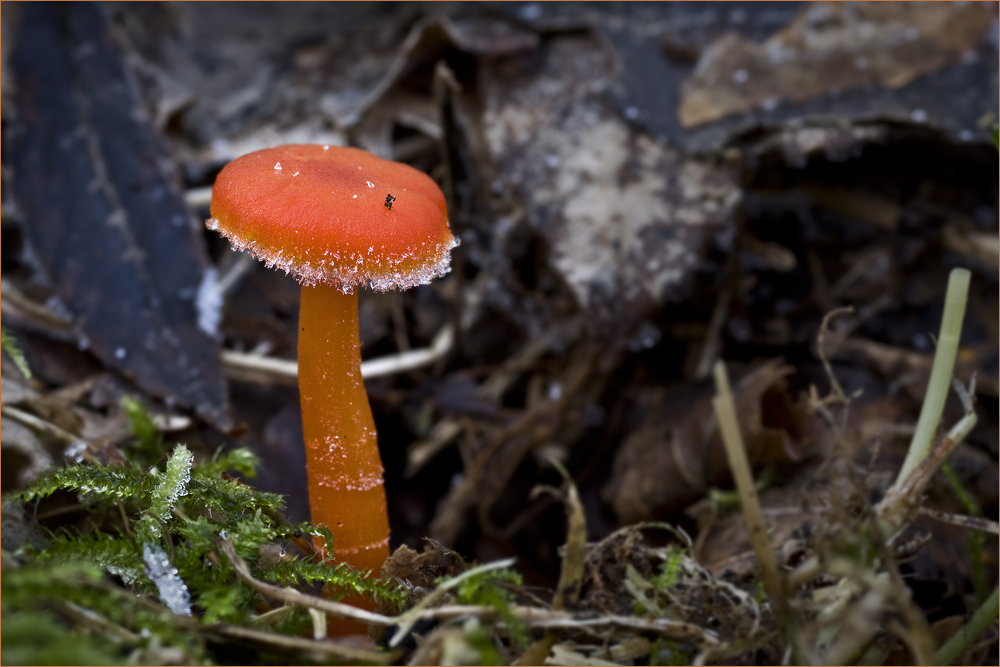 Heute war ich Wald, um zu schauen, was es noch so an Pilzen zu finden gibt. Viel war nicht mehr zu sehen, aber dann fand ich doch tatsächlich einen Saftling. Völlig steifgefroren mit dekorativem Reifrand um den Hut. Ich tippe auf einen Mennigroten Saftling. Er wuchs halbverborgen unter dem gefrorenen Laub. Nach der Fotosession habe ich ihn wieder schön 'warm' eingepackt.