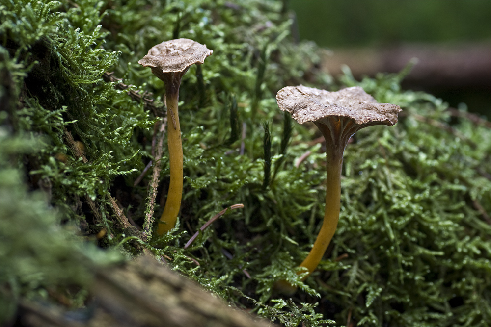 Zum ersten Mal fand ich heute diese Pilze. Sie standen in einer größeren Gruppe im Moos unter Fichten. Einen nahm ich mit nach Hause, um eine Bestimmung zu versuchen. Mein 'Telefonjoker' identifizierte sie als Trompetenpfifferlinge. Bei denen war ich schon vorher mal gelandet, jedoch steht in meinen Büchern, dass die Stiele und der Fruchtkörper hohl sind. Das war bei meinem Exemplar allerdings nicht so.