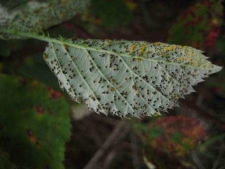 Sieht aus, als seien 2 Pilze auf dem Foto,ein schwarzer und ein oranger. Eine Mischkollektion? Übrigens (man siehts im Bild unscharf): auf der Blattoberseite bilden sich purpurrote (violette) Flecken.