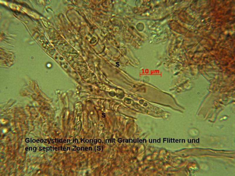 Zu den Septen: die sind hier schon eigenartig. Unten ein anderes Bild dieser Gloeozystiden mit den eng septierten Enden.