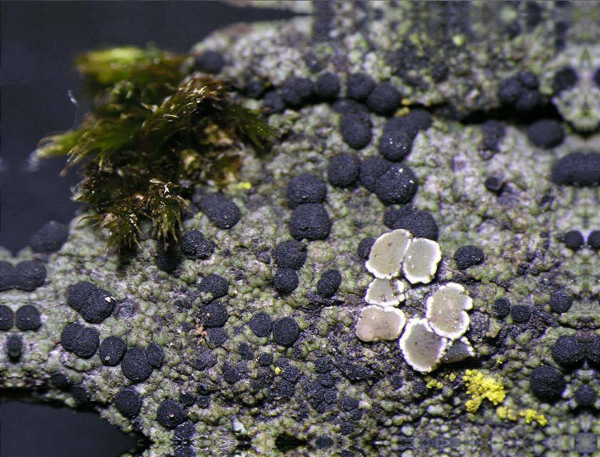 Folgender Fund von Heute ist mir ein Rätsel: Fund auf einem abgestorbenen Obstbaum (vermutlich Aprikose) an der mit Flechten besetzten Rinde. Die hellen Becher, die zuerst meine Aufmerksamkeit erregt haben, sind auch Flechten (welche??). Die schwarzen Knubbel daneben (Durchmesser ca 0,5 mm) habe ich zuerst für Pyrenos gehalten, aber sie sind weich und haben sehr auffällige Mikromerkmale. Das Hymenium ist in eine Gallerte eingebettet, die sich mit Lugol sofort schwarzblau färbt. Bilder der Mikros folgen.