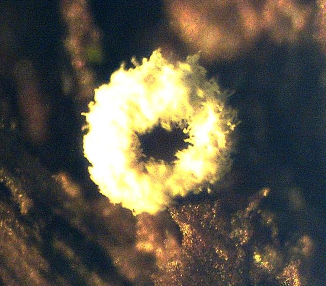 Aber hier erst ein Pilzchen, das leider nicht so gut zu vergrößern war (irgendwie streikt da die USB-Kamera), es sieht aus wie ein sehr wolliger weißer Ring ohne Boden, winzig klein (1 mm). Im Mikroskop konnte ich die genau betrachten, sie scheinen wirklich keinen Boden zu haben. Ich hab nichts entsprechendes gefunden, das Mikroskop sagt bis jetzt, dass es kein Asco ist. Der war jetzt an entrindetem Buchenstamm, Unterseite zu vielen. Weiß es jemand, sonst schick ich morgen ein paar Mikrofotos. LG Ditte