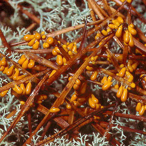 ich komme aus der Botanik und die Pilze sind bei mir immer nur "Abfallprodukt" gewesen. Nun bin ich zur Digitalfotografie umgestiegen und sichte meine zum Teil uralten Dias. Bei den Pilzen geht´s gelegentlich nicht weiter. Meine Artenkenntnisse sind in diesem Bereich lausig. Ich bitte die Pilzexperten, mir bei der Bestimmung etwas auf die Sprünge zu helfen. Bild: Fruchtkörper an Kiefernnadeln, Bei Gifhorn. Vielen Dank im Voraus.