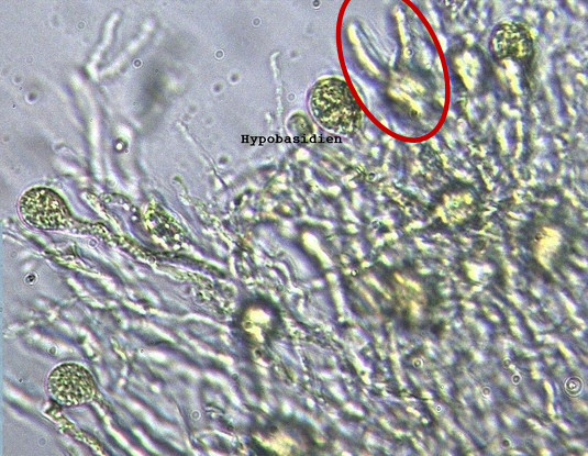 jetzt hast Du ja, wenn auch unscharf, eine Hypobasidie mit 2 Epibasidien fotografiert (rote Markierung). Die nur blasigen Hypobasidien würde ich einem jüngeren Entwicklungsstadium zuschreiben, d.h. die Längswände werden erst noch eingezogen, gleiches gilt für das Wachstum der Epibasidien. Gruß, Andreas