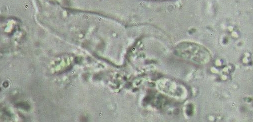 Liebe Andreas und Ingo, ihr hattet natürlich recht, hier hab ich jetzt eine Basidie fotografiert, man kann es doch sehen, oder?? (Mit zwei noch dran hängenden Sporen).