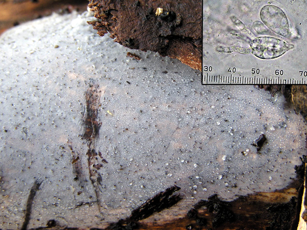 Hallo Ditte, sehr schöne Basidie und gut zu erkennen, dass es eine ganz normale Holobasidie ist. Exidiopsis calcea ist wirklich weiß oder grauweiß, während Vuilleminia diesen opalisierenden oder irisierenden Ton in der Farbe hat und meist auch ein wenig rosastichig ist. Ferner ist Vuilleminia dicker als Exidopsis, die nur dünne seifige Beläge macht und letztlich ist die Ökologie etwas anders. Die Vuilleminia-Fruchtkörper liegen immer rechts und links begrenzt von Rinde, wie reingegossen, während Exidiopsis calcea völlig entrindete Äste besiedelt. Anbei mal ein Bild von Exidiopsis effusa, die zwar nicht calcea ist und farblich etwas anders aussieht, jedoch von der Konsistenz und Dicke schon sehr ähnlich ist. Ich denke, da sieht man den Unterschied zu Vuilleminia schon recht deutlich, die ja gegen die Exidiopsis fast "fleischig" wirkt. Im Eck oben eingeblendet eine Exidiopsis-Basidie mit den schlauchartigen Sterigmen. beste Grüße,
