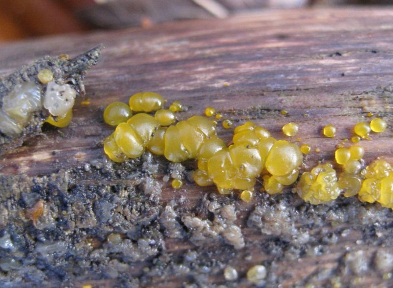 Hallo zusammen, wahrscheinlich auf Buche hab ich an einem toten Ast diese aufälligen kleinen Pilze gefunden. Sie befanden sich an der Unterseite des Holzes, also in der Erde. Laienhaft vermute ich mal auf Grund der Konsistens eine Exidia, finden kann ich darüber aber nichts. Weiß jemand mehr? Beleg vorhanden. Liebe Grüße Kirsten