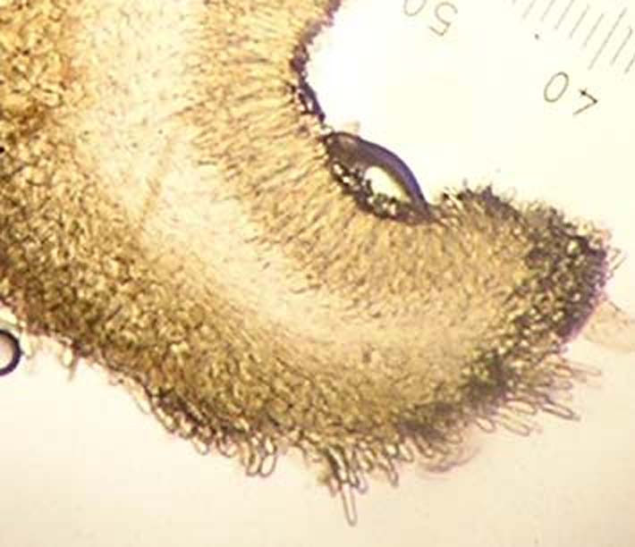 : Ich wußte, daß ich mir jetzt wieder die Nacht um die Ohren hauen werde! ;-) : Viele Grüße, Martin Hallo Martin, na,d as passt doch. Ich hatte ja geschrieben, entweder erst blau dann rot oder direkt rot. Hängt alleine von der Jodkonzentration ab. Die Sporengröße passt auch, allerdings sehe ich auf deinen Mikrobildern keine Tropfen in den Sporen. Dazu sind die einfach zu kleine (die Bilder, nicht die Sporen). Auch auf dem Schnitt kann ich nicht viel erkennen. Die Würzelchen sind das Subikulum, aber wichtiger wäre ein sauberer Schnitt des Randbereiches an der Seite hoch zum Rand. M. elegantior sollte recht lang abstehende "Haare" haben. Hier ein zugegebenermaßen sehr besch..... Schnittbild vom Rand. Es ist ein digitalisiertes Dia aus der Anfangszeit und qualitativ mies. Aber dennoch kann man die mehrzelligen abstehendenen Randzellen sehen. Mollisien bestimmen ist leider (?) mit einem recht hohen mikroskopoischen Aufwand für relativ banale Merkmale verbunden. Zudem sind oft die Unterschiede nicht sehr groß sind und überhaupt die Gattung recht monoton. Russula und Psathyrella ist spannender. beste Grüße,