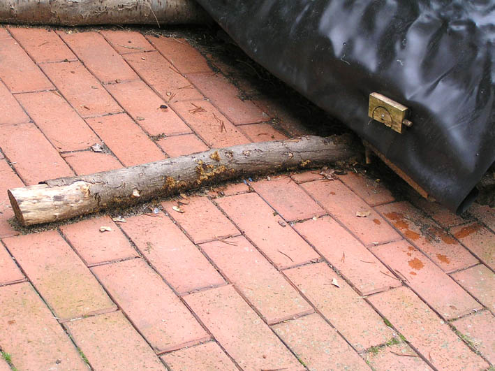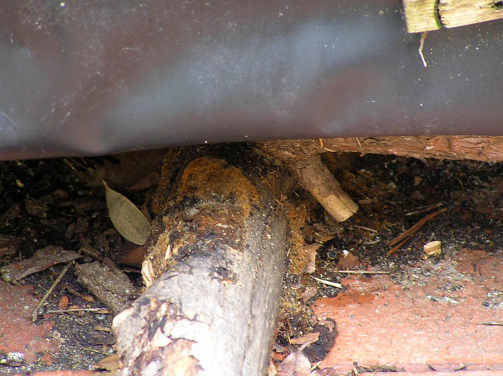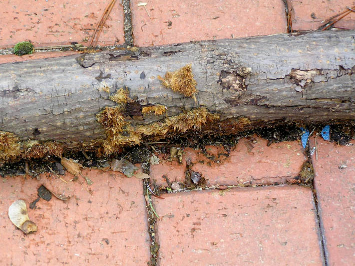 Der Pilz war wesentlich größer und wuchs üppig über das Holz hinaus auf die mit etwas Erde bedeckten Fliesen. Mein Mann hat sehr gründlich saubergemacht, so dass jetzt nur noch einige Reste am Holz zu finden sind.